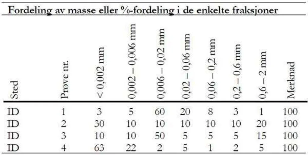 Diagram med fire eksempler på jordarter med tilhørende tabell over andel leire, silt og sand.