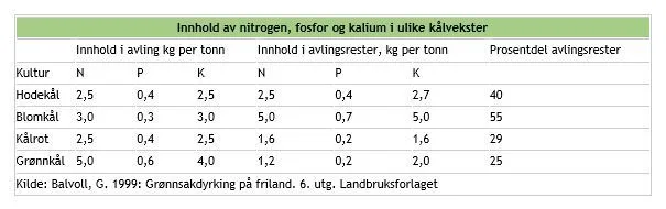 Den store utfordringa når en dyrker næringskrevende grønnsakskulturer økologisk, er å gi gjødsel i en slik form at næringa er tilgjengelig når plantene trenger det. De fleste kulturene innenfor kålslekta må ha god tilgang på nitrogen helt fram til høsting. Spesielt omkring hodedanninga er næringskravet stort. Blir tilgangen på nitrogen for liten forsinkes veksten. Hodene blir små og kompakte og veksttida forlenges. Det er en stor fordel å ha tilgang på lettomsettelig gjødsel. Urin, fjørfemøkk, eventuelt bløtgjødsel (storfe/svin) er aktuelle kilder. Dersom nitrogentilgangen blir for stor, kan hodene bli løse og noen sorter vil lett sprekke. Sterk gjødsling kan også øke faren for angrep av enkelte insektarter.