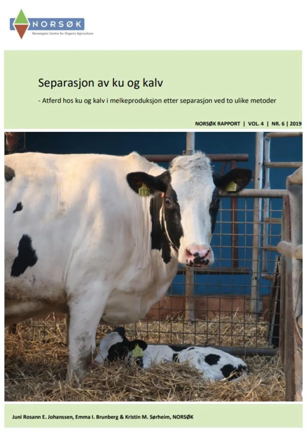 Johanssen, J.R.E., Brunberg, E.I. & Sørheim, K.M. 2019. Separasjon av ku og kalv – Atferd hos ku og kalv i melkeproduksjon etter separasjon ved to ulike metoder. NORSØK rapport nr. 6, 2019.