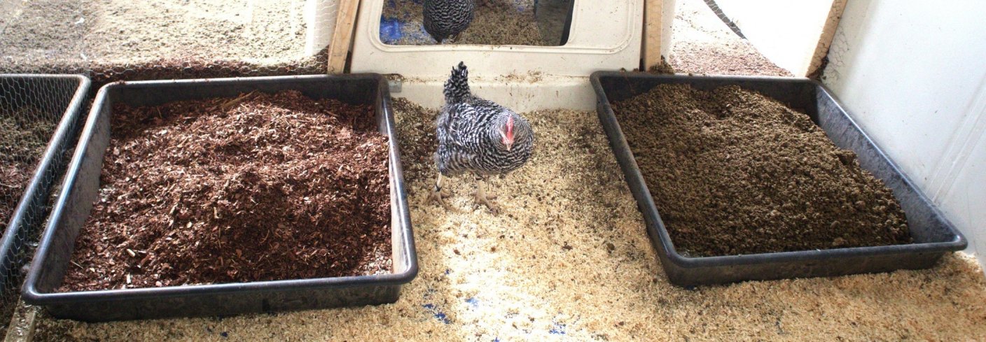 Hønene kunne velge mellom strøbad med bark (venstre) og separert storfegjødsel. (Høyre) Slik kunne forskerne følge med på hva hønene foretrakk og hvordan det påvirket dyra. Foto: Rosann JohanssenKan separert storfegjødsel brukes som strøbad til høns?
