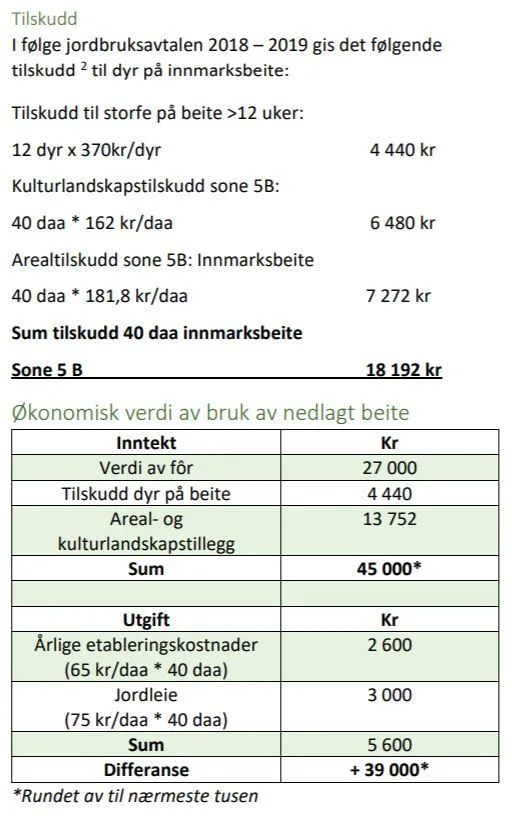 De økonomiske konsekvensene ved å ta i bruk slike arealer vil naturligvis variere mellom områder, gårder og år. Det er derfor ikke mulig å gi en «fasit» på hva det økonomiske resultatet blir ved å ta i bruk x-antall dekar dyrkamark eller beite i inn- eller utmark. Jordbruksarealer som har vært ute av drift noen år kan se temmelig håpløse ut, men dette eksemplet viser at de kan bli viktige bidrag til gårdsdrifta. Med tanke på at norsk matproduksjon og selvforsyningsgrad skal økes ved bruk av egne ressurser må fôrressursene i inn- og utmark brukes i langt større grad enn det som er tilfellet i dag.