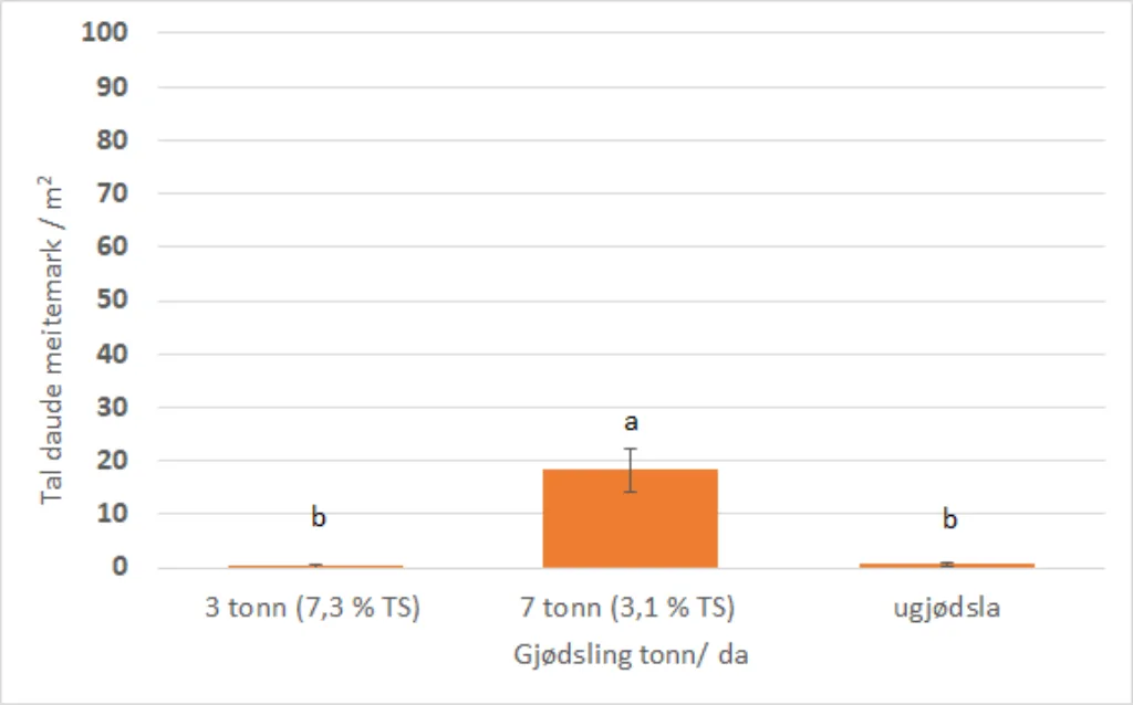 Det vart funne fleire daude meitemark på overflata like etter gjødslinga om våren med 7 tonn vassblanda/daa enn med 3 tonn vanleg blautgjødsel/da eller inga gjødsling, se figur. Forskjellen var statistisk sikker (p ≤ 0,05). Vi fann både daude individ av meitemarkarter som lever øvst i jordlaget og artar som vi vanlegvis finn djupare i jorda.