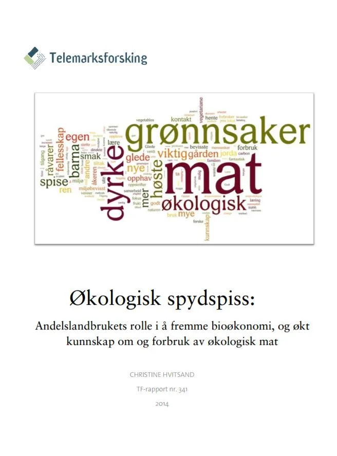 Hvitsand, C. 2014. Økologisk spydspiss: Andelslandbrukets rolle i å fremme bioøkonomi, og økt kunnskap om og forbruk av økologisk mat.TF-rapport nr. 341, 2014