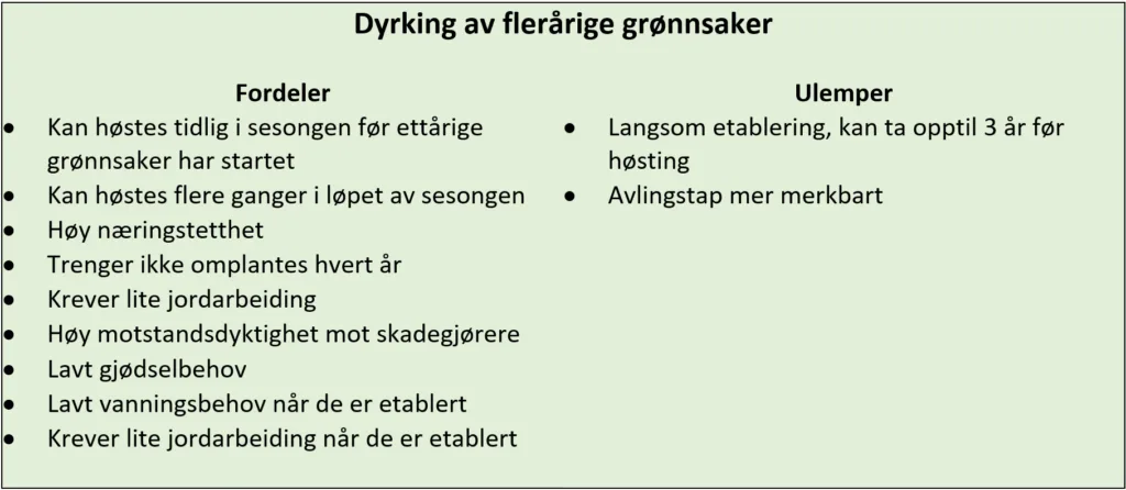 Flerårige grønnsaker er relativt ukjente for yrkesdyrkere i Norge, men slike grønnsaker har mange fordeler sammenlignet med ettårige. De flerårige grønnsakene forlenger sesongen ettersom de begynner å vokse tidlig i sesongen og kan høstes allerede i mai. Dyrkingssystemer med flerårige avlinger er klimasmarte fordi de etter etablering krever mindre eller ingen jordarbeiding og har lavere vanningsbehov. De bidrar også til biologisk mangfold under og over bakken.