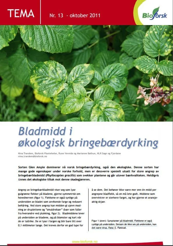 Trandem, N. m.fl. 2011. Bladmidd i økologisk bringebærdyrking.Bioforsk Tema nr. 13, 2011.