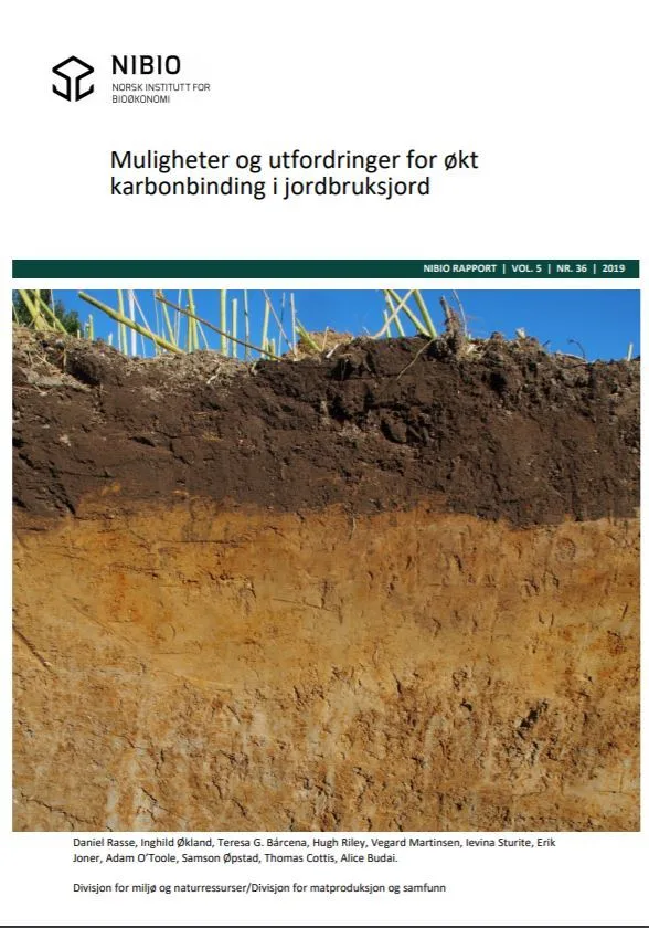 Rasse, D. m.fl. 2019. Muligheter og utfordringer for økt karbonbinding i jordbruksjord. NIBIO Rapport nr. 36, 2019