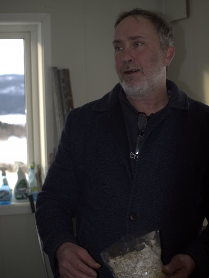 Jørgen tar imot oss med en kopp kaffe en dag midt i februar med snø ute, men inne vokser og trives sopp og gris – hver for seg vel å merke. Både sopp og gris må skjermes mot angrep av virus, bakterier og uønsket sopp utenfra. Grisedrifta har gått fra 400 dyr til 150.