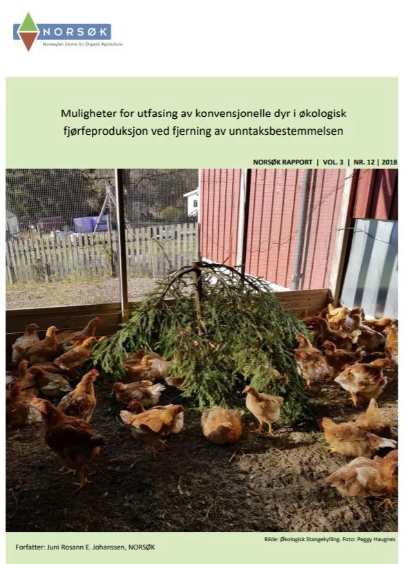 Johanssen, J.R.E. 2018. Muligheter for utfasing av konvensjonelle dyr i økologisk fjørfeproduksjon vad fjerning av unntaksbestemmelsen. NORSØK Rapport nr. 12, 2018